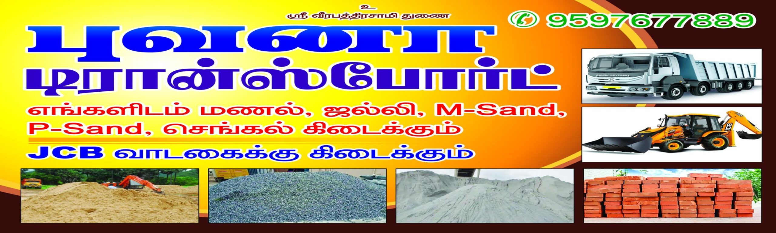 Welcome to **Puvana Transport**, your trusted partner for all construction material needs. We supply high-quality **sand, jelly (blue metal), M-Sand, P-Sand, and bricks** at competitive prices to support your building projects. With reliable service and timely delivery, we ensure that your construction never slows down. In addition to materials, we also provide **JCB hire services**, making us a one-stop solution for all your construction requirements. At Puvana Transport, customer satisfaction and quality are our top priorities. Contact us today at **9597677889** for hassle-free service and quick delivery.