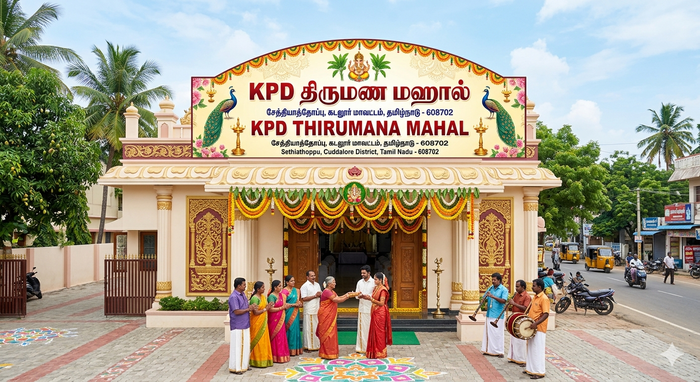 கடலூர் மாவட்டம், சேத்தியாத்தோப்பில் ஒரு சிறப்பான சுப நிகழ்ச்சியை நடத்த நீங்கள் திட்டமிட்டிருந்தால், KPD திருமண மஹால் (KPD Thirumana Mahal) ஒரு மிகச்சிறந்த தேர்வாகும். குறிப்பாகச் சேத்தியாத்தோப்பு மெயின் ரோட்டில் அமைந்துள்ளதால், வெளியூர் விருந்தினர்கள் வந்து செல்வதற்கு இது மிகவும் வசதியாக இருக்கும்.