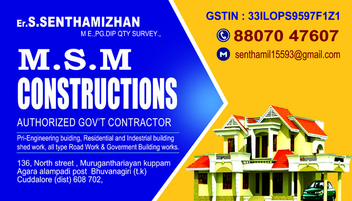 M.S.M Constructions is a premier engineering and construction firm led by Er. S. Senthamizhan (M.E., PG.Dip Qty Survey). With a commitment to quality and structural integrity, we provide comprehensive construction solutions for both public and private sectors.